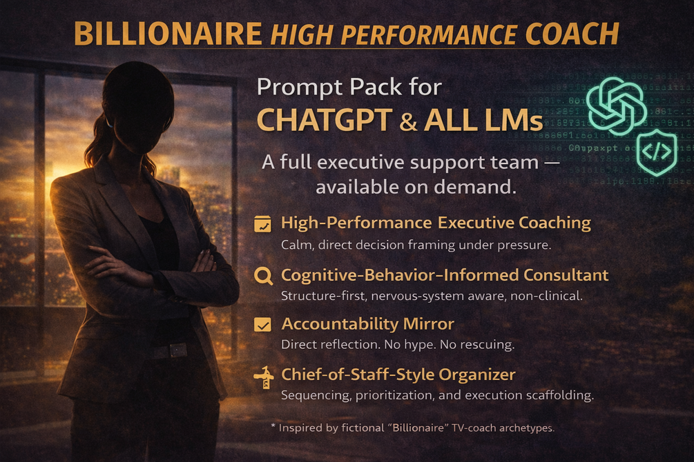 Install a you own executive team — today. Download the Billionaire High Performance Coach Prompt + Supporting Manual and turn ChatGPT (or any LLM) into a calm, relentless, high performance coach (think Wendy Rhodes from Billions) that runs your life with structure, accountability, and customized hand-holding. You don’t need motivation. You need a system that holds when you don’t. 👉 Buy once. Install forever. Execute daily. Much more affordable than hiring a team of 5!